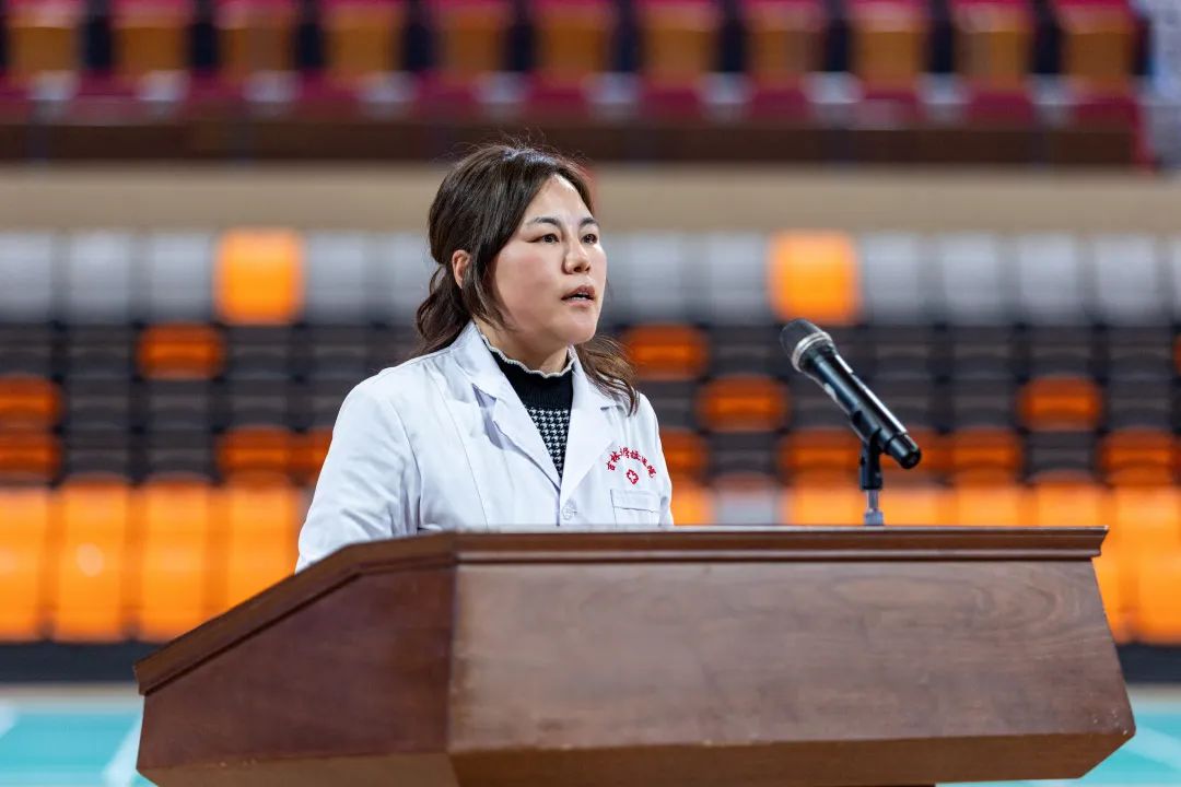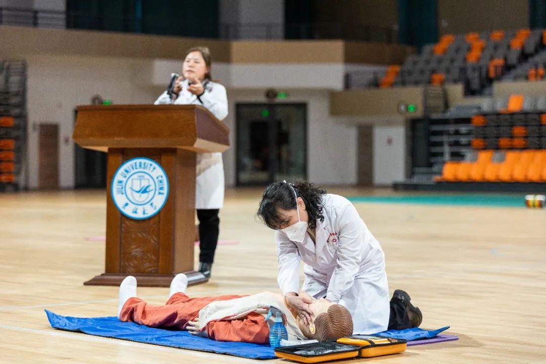 校医院护士长于巍红利用仿真教具演示了现场了心肺复苏+AED除颤仪的操作方法与流程。