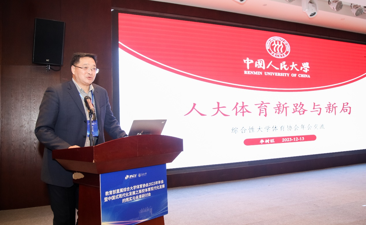 中国人民大学体育部主任李树旺以《新时代学校体育高质量发展的困惑、困境与创新尝试——基于人大体育的思考》为主题进行经验交流。经验交流会由中国海洋大学体育系主任李世明主持。李树旺教授聚焦“人大体育新路与新局”,介绍了人大体育发展的脉络与传承,从体育教学、体育学科和科研、校园体育文化等方面分享了“人大经验”,从发挥“体育学科”的基础性作用、塑造适合本校特色的高校体育核心竞争力、重塑学校体育竞争精神的引领价值等方面进行建设性和前瞻性探讨,为助力各高校体育工作取得新突破提供了许多宝贵的经验和启示。