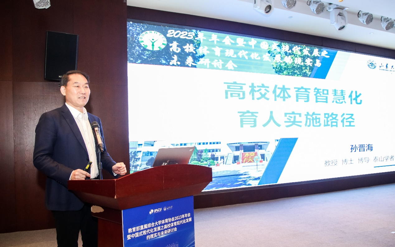 山东大学德赢winac米兰院长孙晋海以《高校体育智慧化育人的实施路径》为主题进行经验交流。经验交流会由中山大学体育部主任范振国主持。孙晋海教授全面深入阐述了高校体育智慧化育人的内涵,并进一步从时代需求、现实困境、路径设计和实施策略等维度系统探讨了高校体育智慧化育人新模式,为数字时代开创高校体育智慧化育人新篇章提供了重要参考和有益借鉴,为加快促进高校体育现代化发展提供了诸多富有建设性的思路和启发。