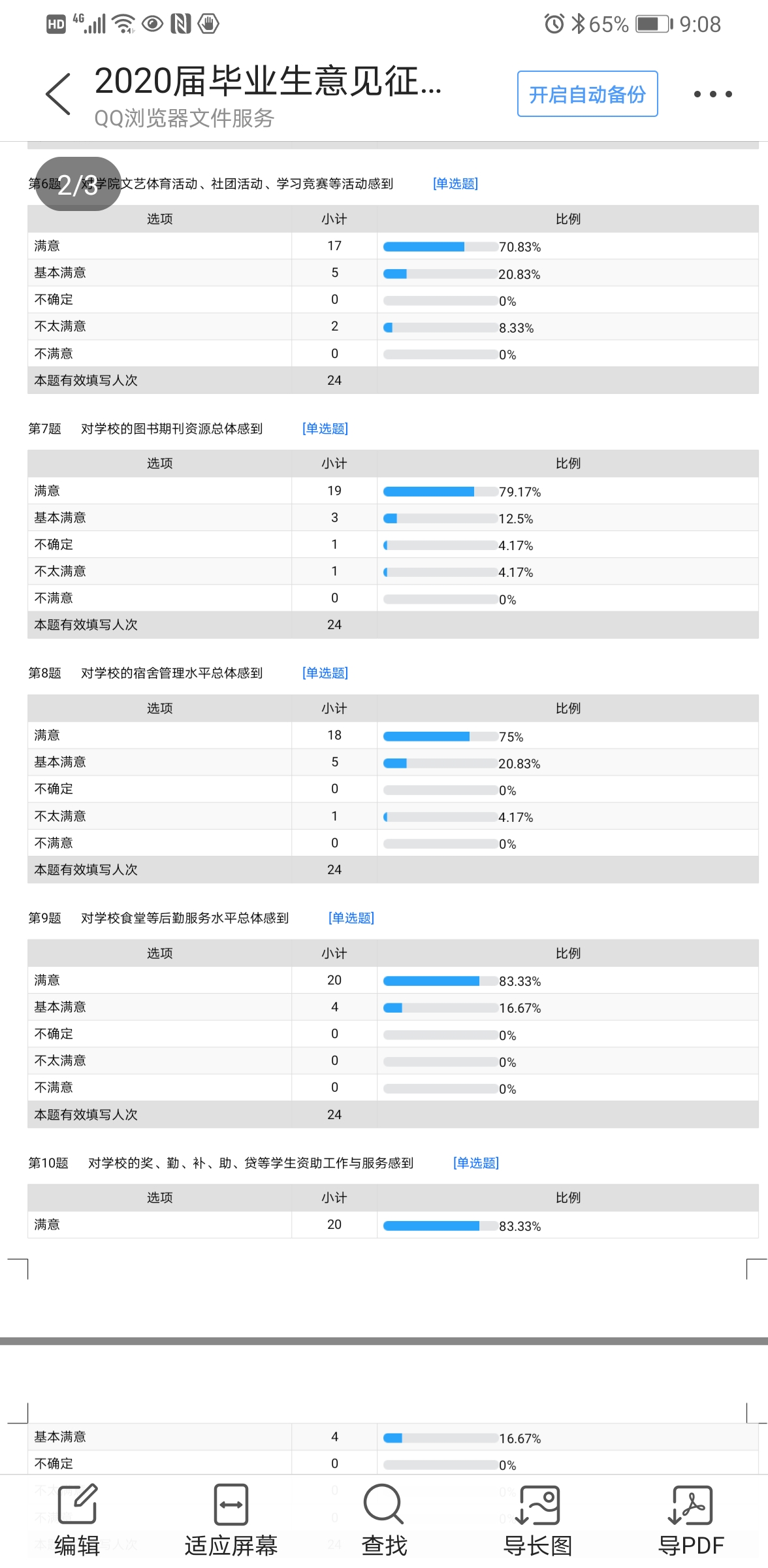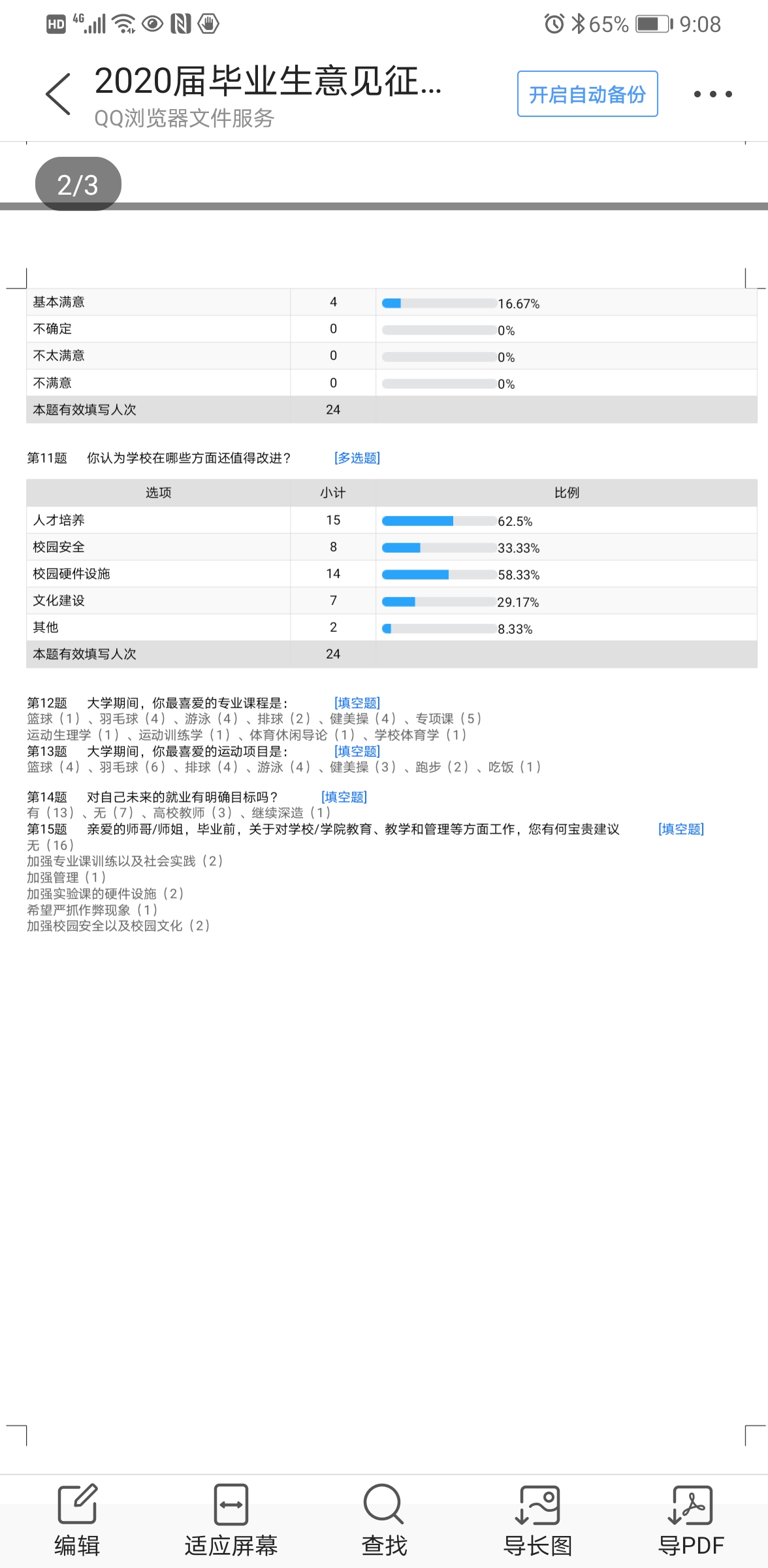 活动初期,德赢winac米兰学生会在辅导员王祎老师指导下,制作了一份包含15道题的调查问卷,涵盖了对学校发展建设、治校办校方面的意见建议。随后,2020届本科毕业生认真填写了问卷,相关负责人对问卷信息进行了整理和总结。通过对问卷调查结果的统计,学生对学校的硬件设施建设和后勤保障等校园软件服务十分满意,针对学校人才培养和文化建设等方面提出了一些建议。
