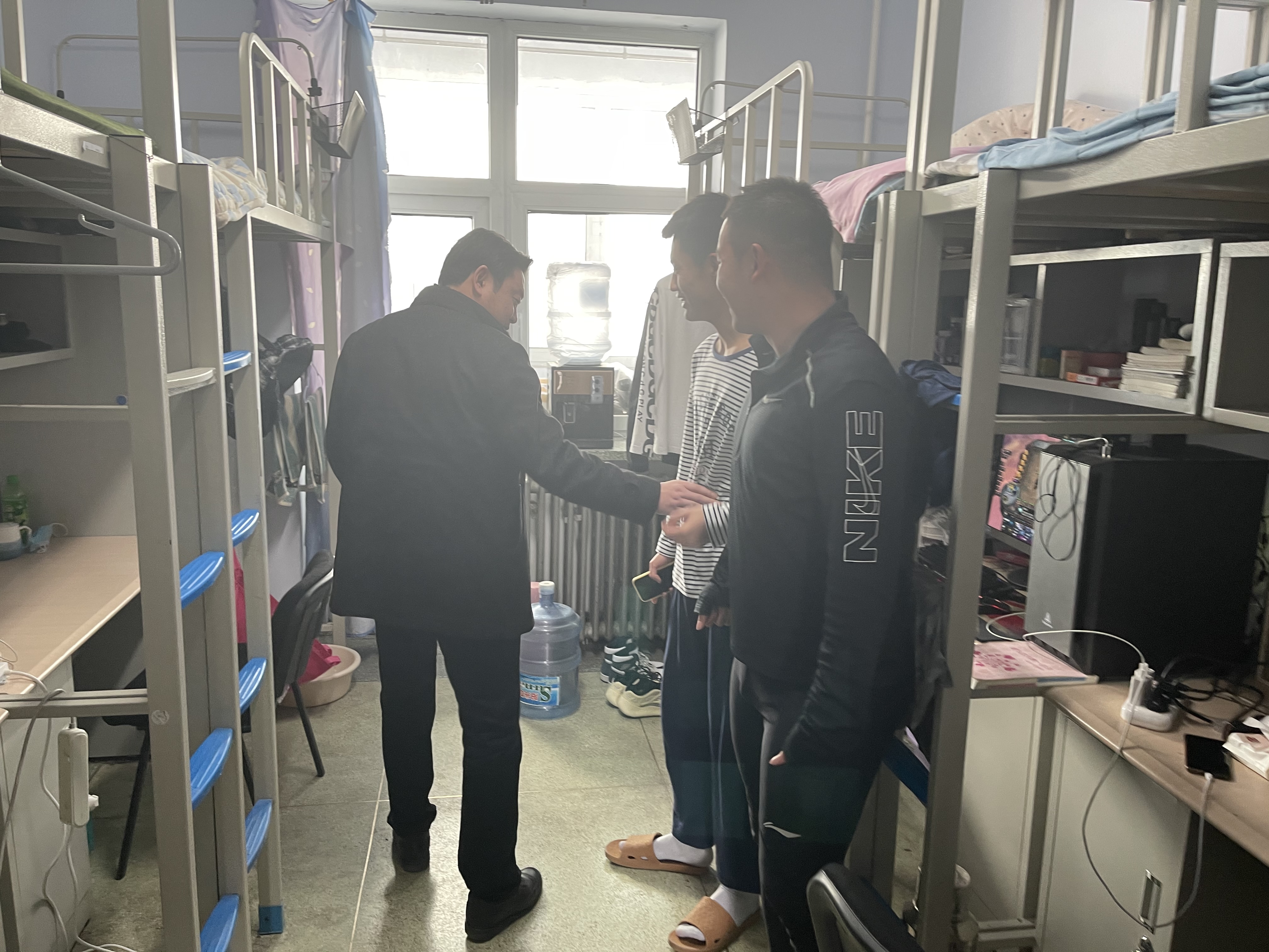 为迎接同学们顺利返校,做好返校后的寝室安全防疫工作。2021年3月18日中午,学院党委副书记兼副院长田进、全体辅导员带领学生干部对所有本科生寝室进行了新学期卫生安全大检查。