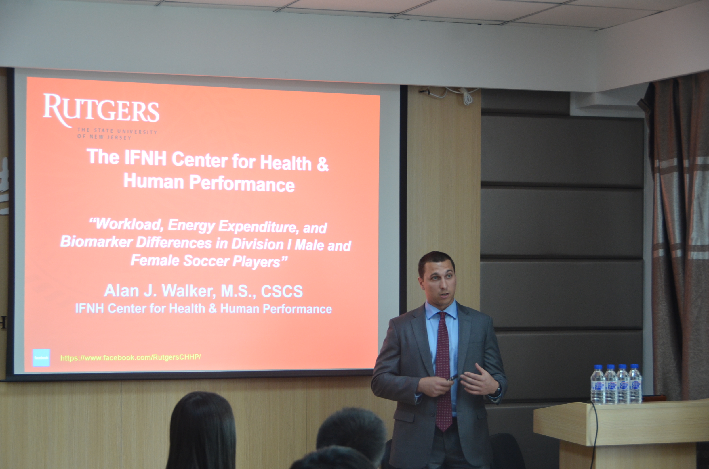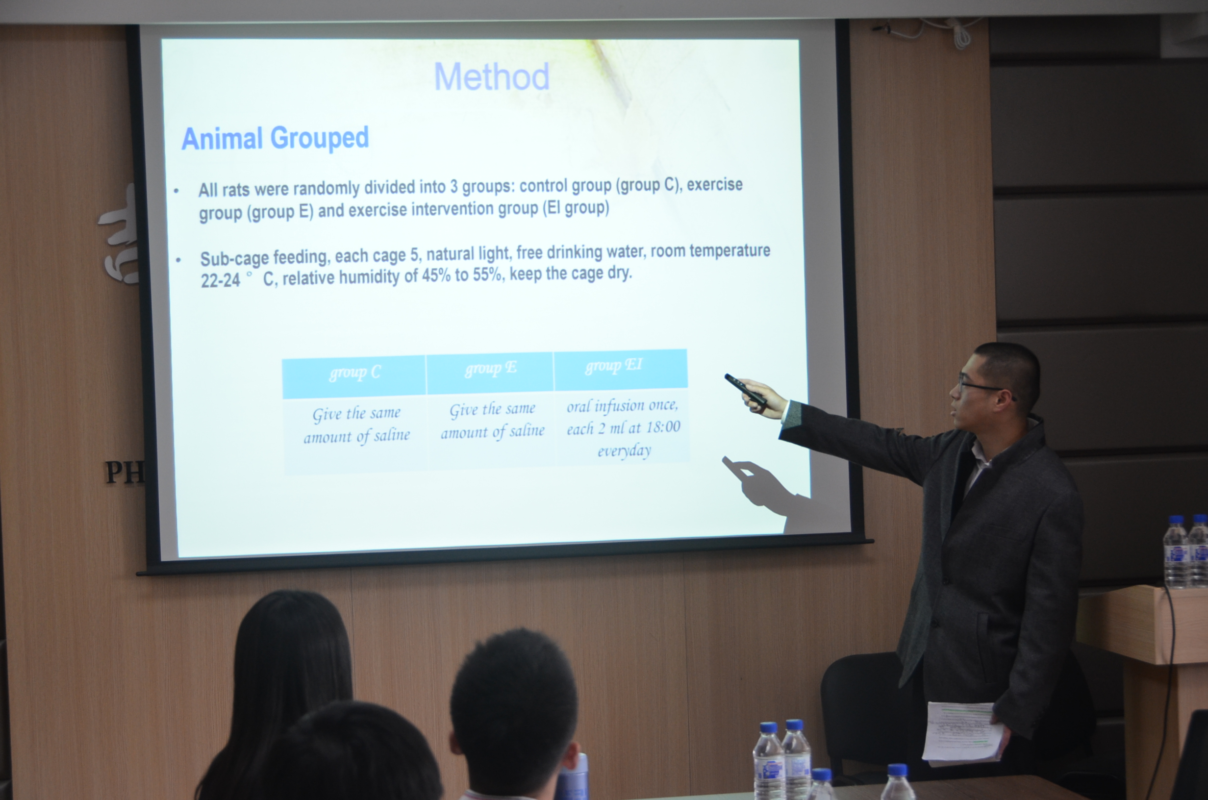 Alan博士就他最近的研究“Division I 男女足球运动员的工作量,能量消耗和生物标志差异”进行了讲解。德赢winac米兰研究生刘彬、曲申、吴梦也分别就自己学习期间所做研究进行了汇报和讲解并与Alan博士进行了交流探讨。赵扬老师邀请Alan博士分享一些他在学习和科学研究方面的心得, Alan博士表示要在科研中全情投入,努力学习,尽自己最大的力量。